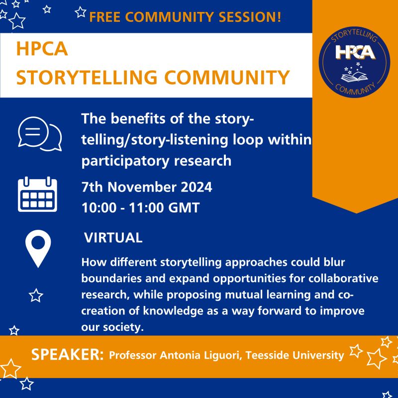 I am delighted to join the Healthcare Project and Change Association – HPCA for the november webinar with a talk on “The benefits of the story-telling/story-listening loop within participatory research: exploring diverse experiences and methods for the co-production of knowledge”.